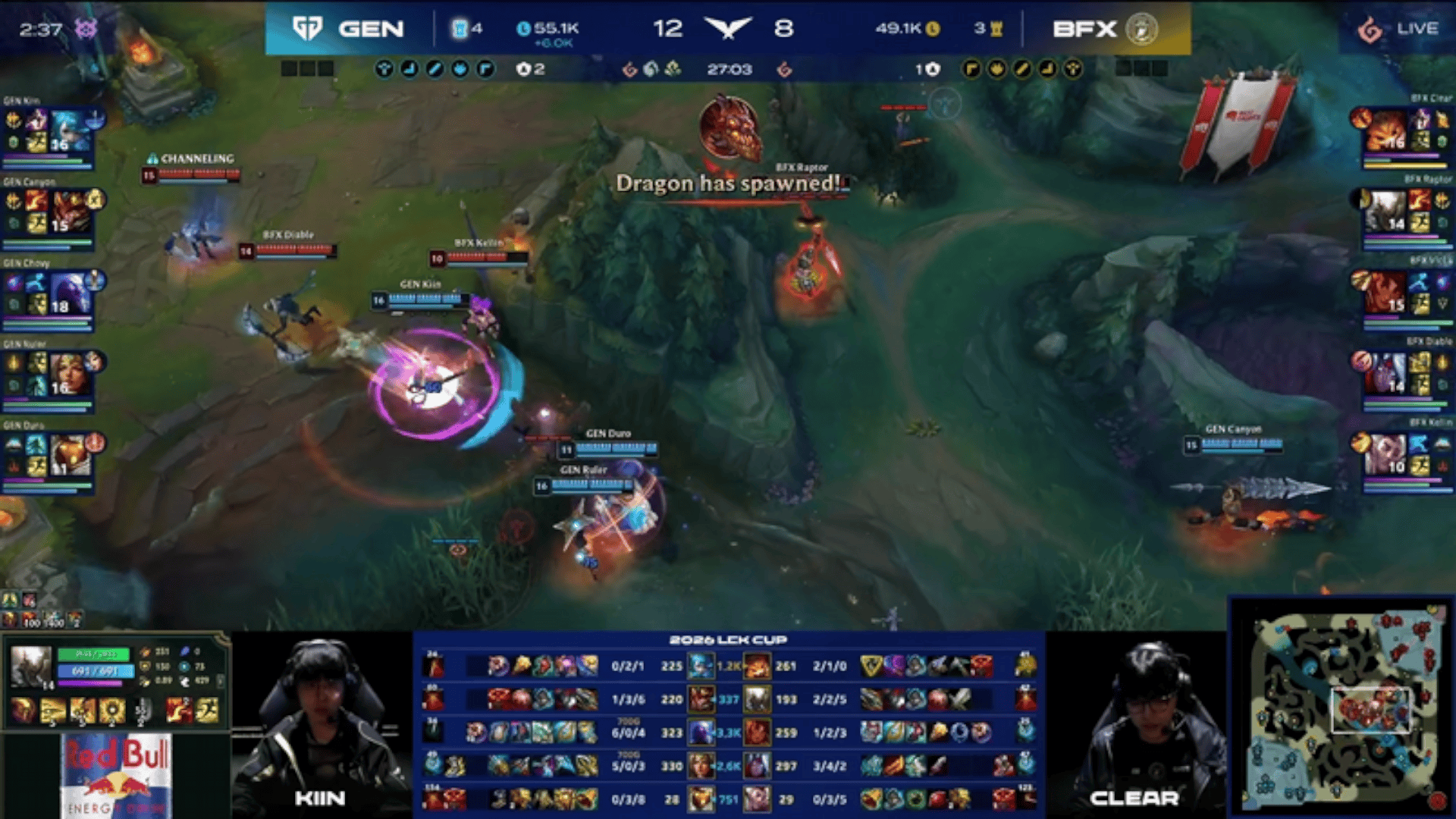 LCK:Kiin格温爆砍双杀,GEN上中接管团战瞬间0换3