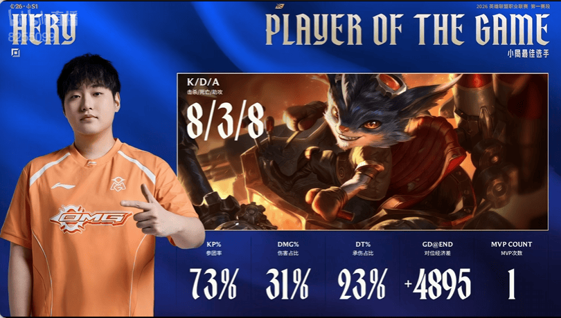 Hery兰博打出8/3/8战绩,拿到OMG对阵EDG次局比赛MVP