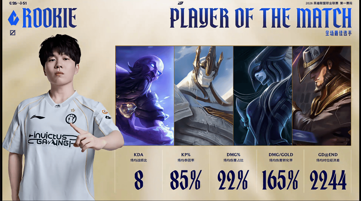 Rookie四局比赛打出16/7/43战绩,斩获IG对阵NIP大场MVP