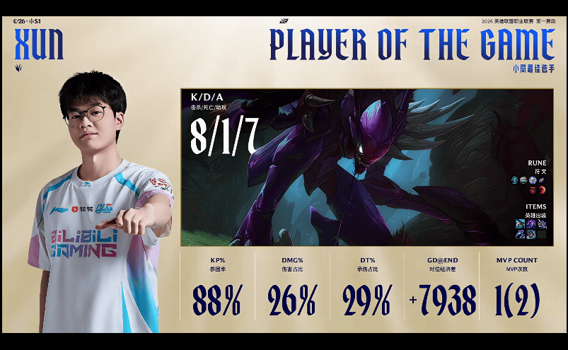 Xun使用螳螂打出8/1/7战绩,斩获BLG对阵JDG第四局MVP