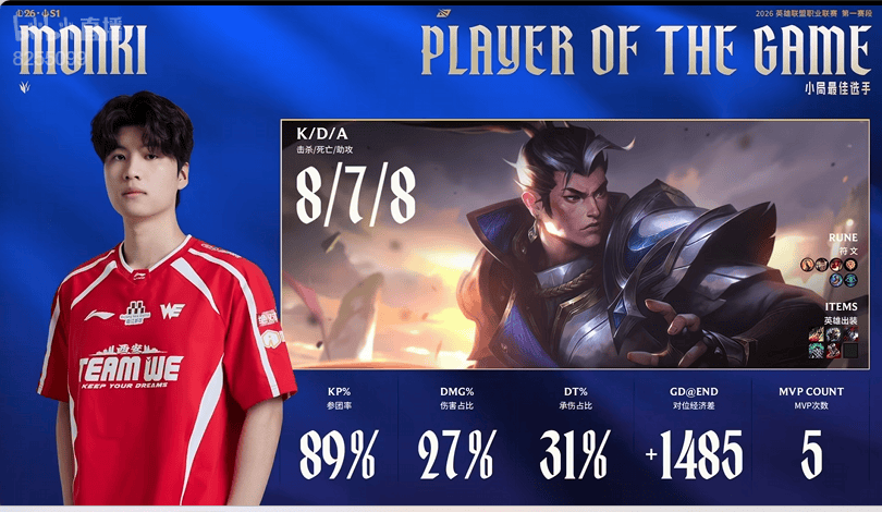 Monki赵信打出8/7/8战绩,拿到WE对阵LNG次局比赛MVP