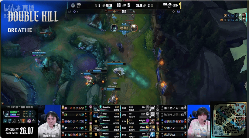 ON牛头捡先锋后直接放先锋残血开车逃跑并吸引阿萝拉追击,BLG打出三换四
