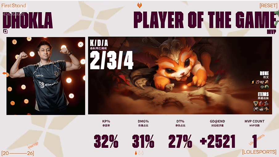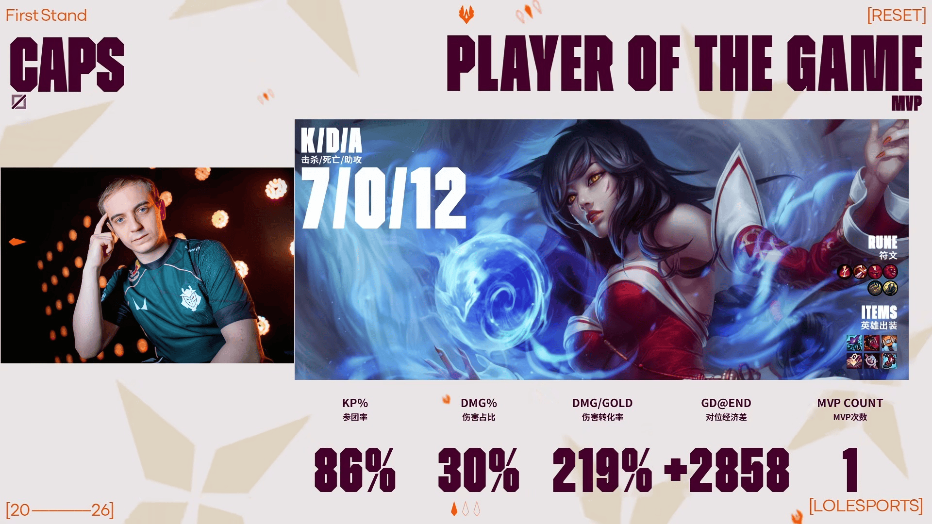Caps阿狸砍下7/0/12的数据,拿下G2对阵TSW首局MVP