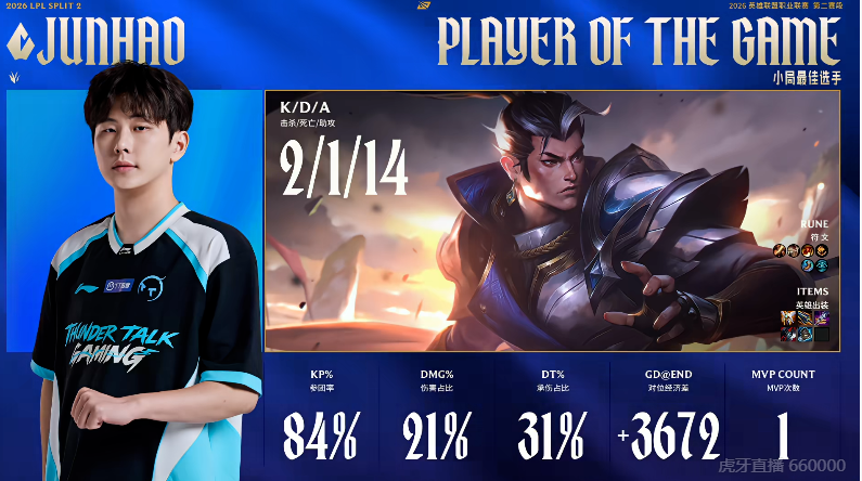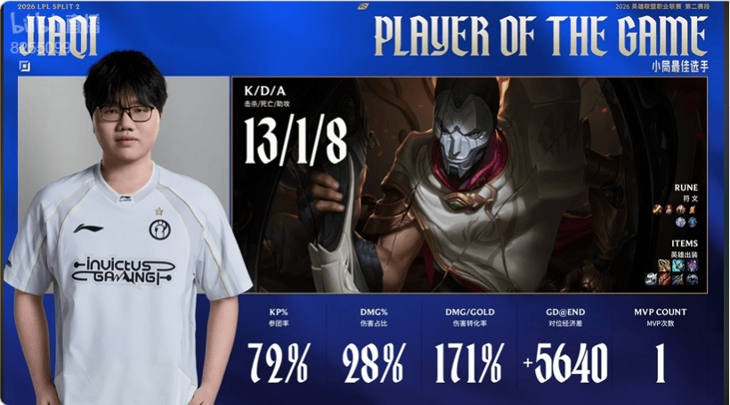Jiejie操刀皇子打出7/0/19战绩,拿到WBG对阵IG次局比赛MVP