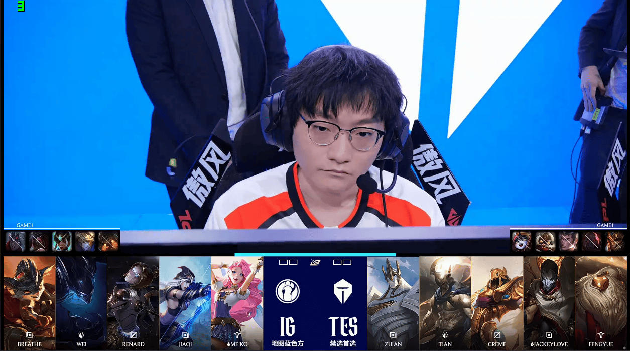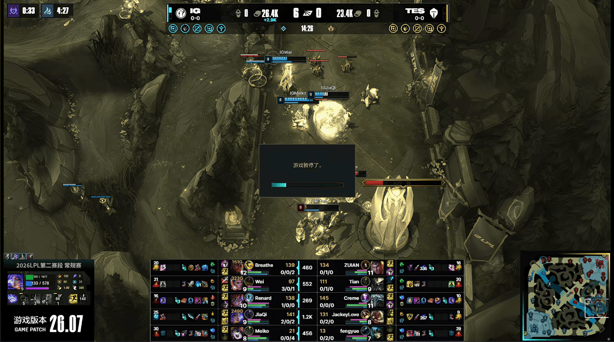 IG对阵TES第二局比赛,因Wei反应游戏内问题发生技术暂停