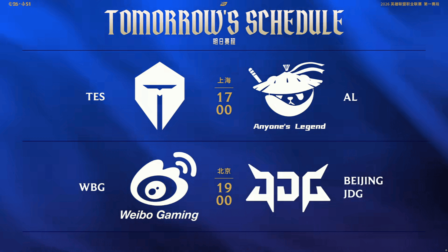 2026LPL第一赛段W2D6虎扑墙:TES vs AL、WBG vs JDG