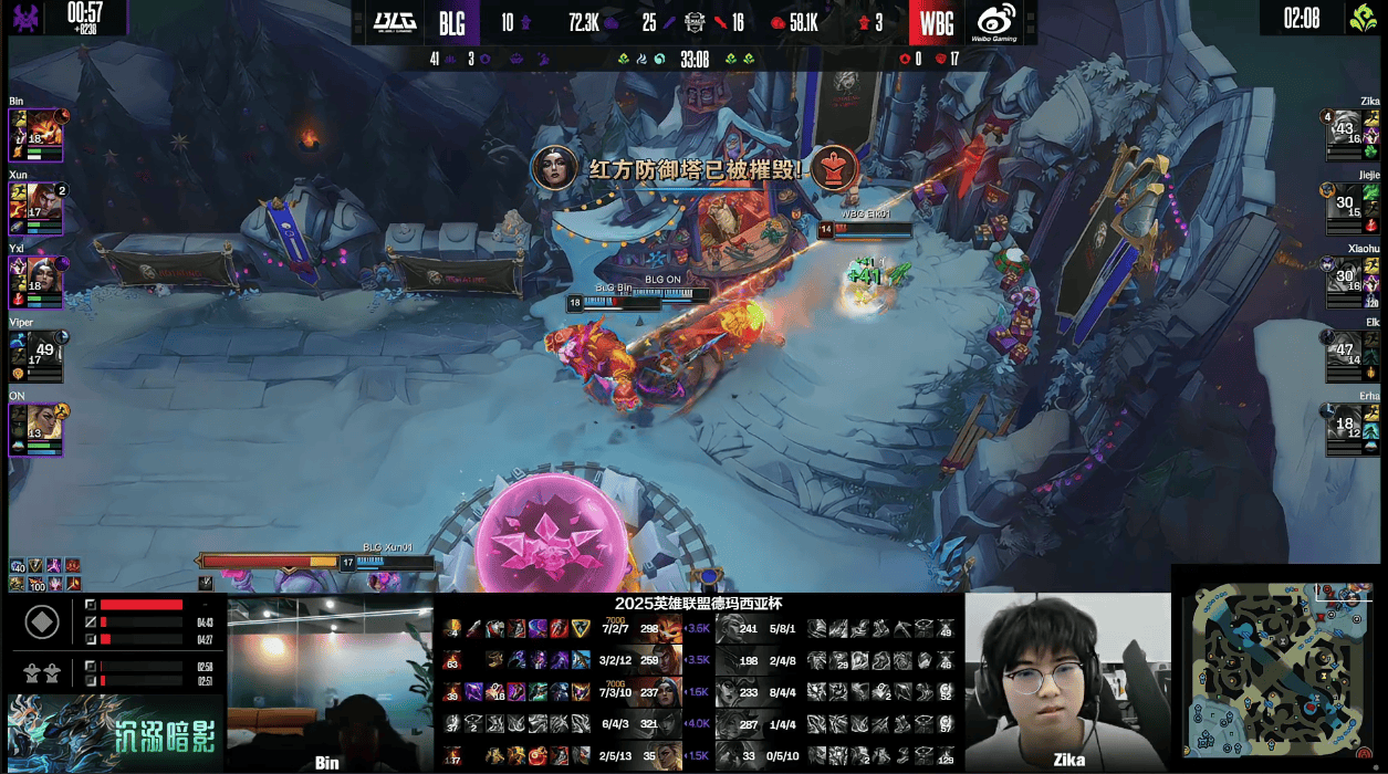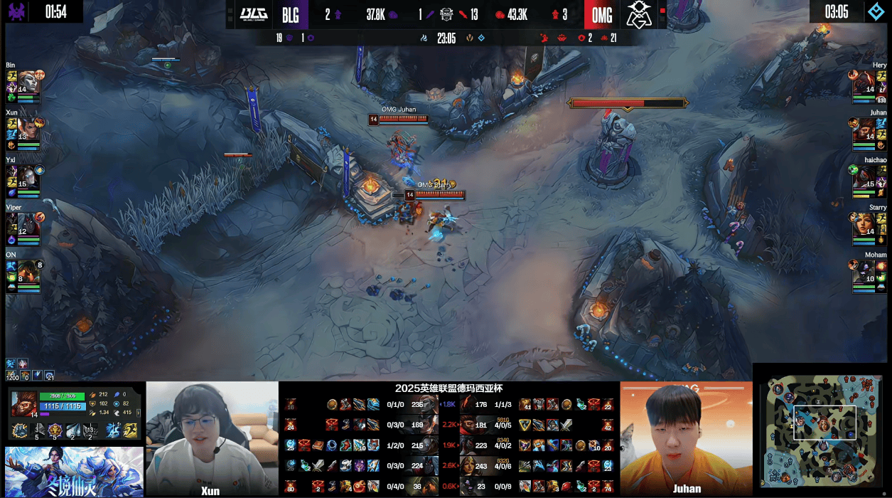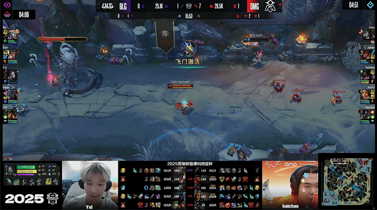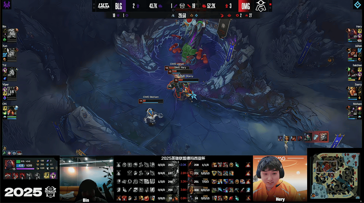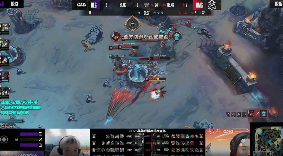 OMG团战控制拉满瞬间融化BLG下路组合,Bin双拳难敌十手被集火击杀