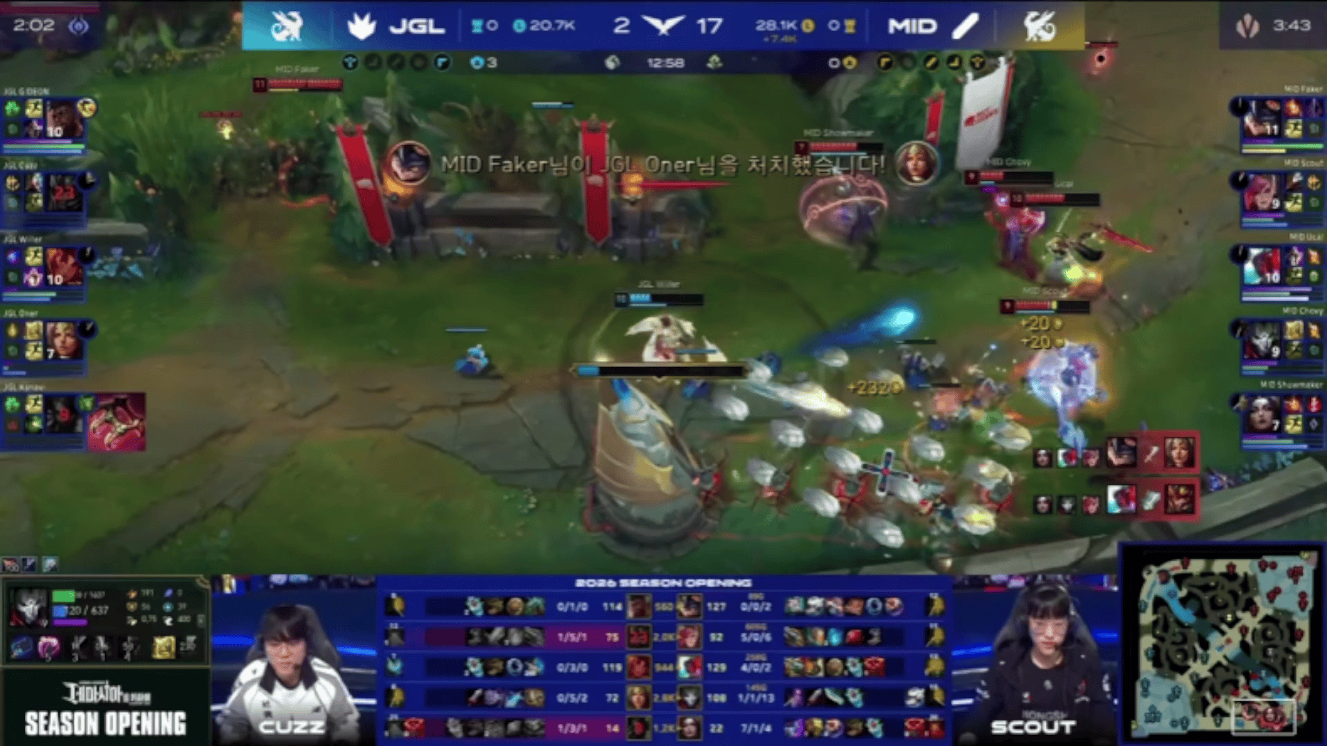 Kingen兰博对位单杀Faker亚恒,随后被Scout收掉