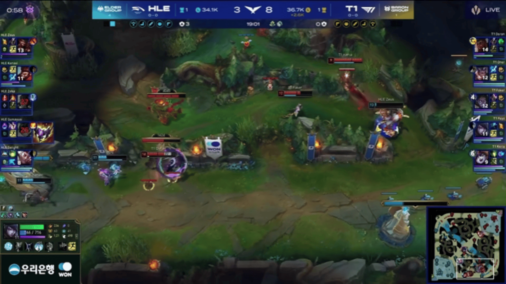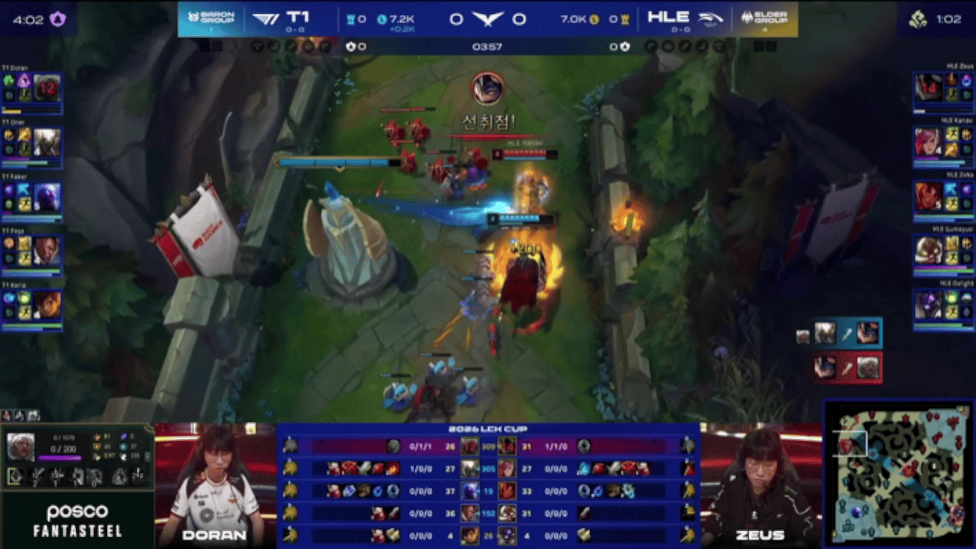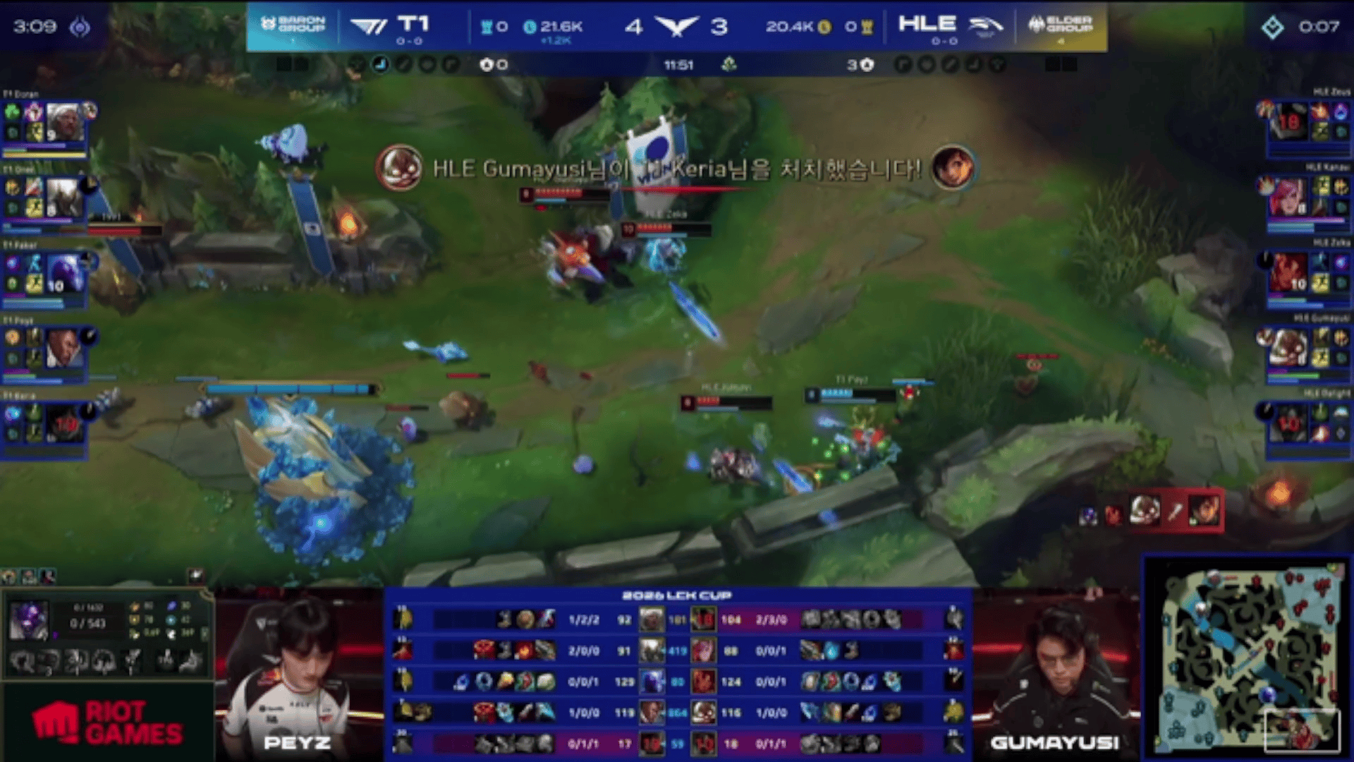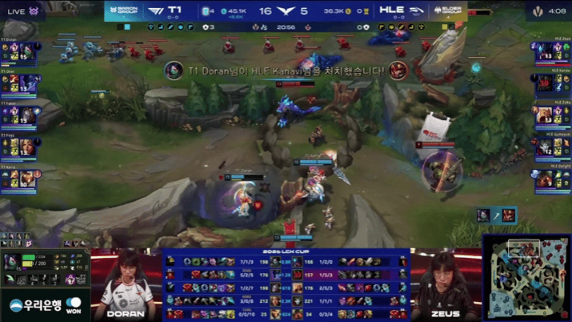 LCK:Doran奎桑提单吃Guma,T1追击得手1换4大胜HLE