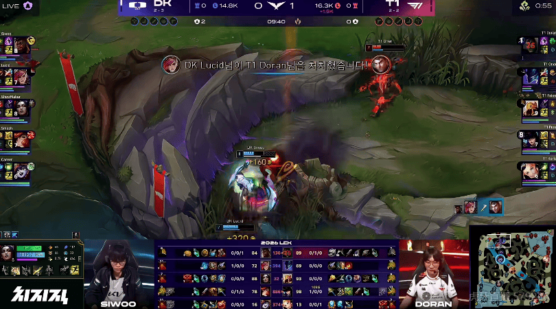 T1上野纠缠河蟹被Siwoo奎桑提大招命中,Doran杰斯交出人头