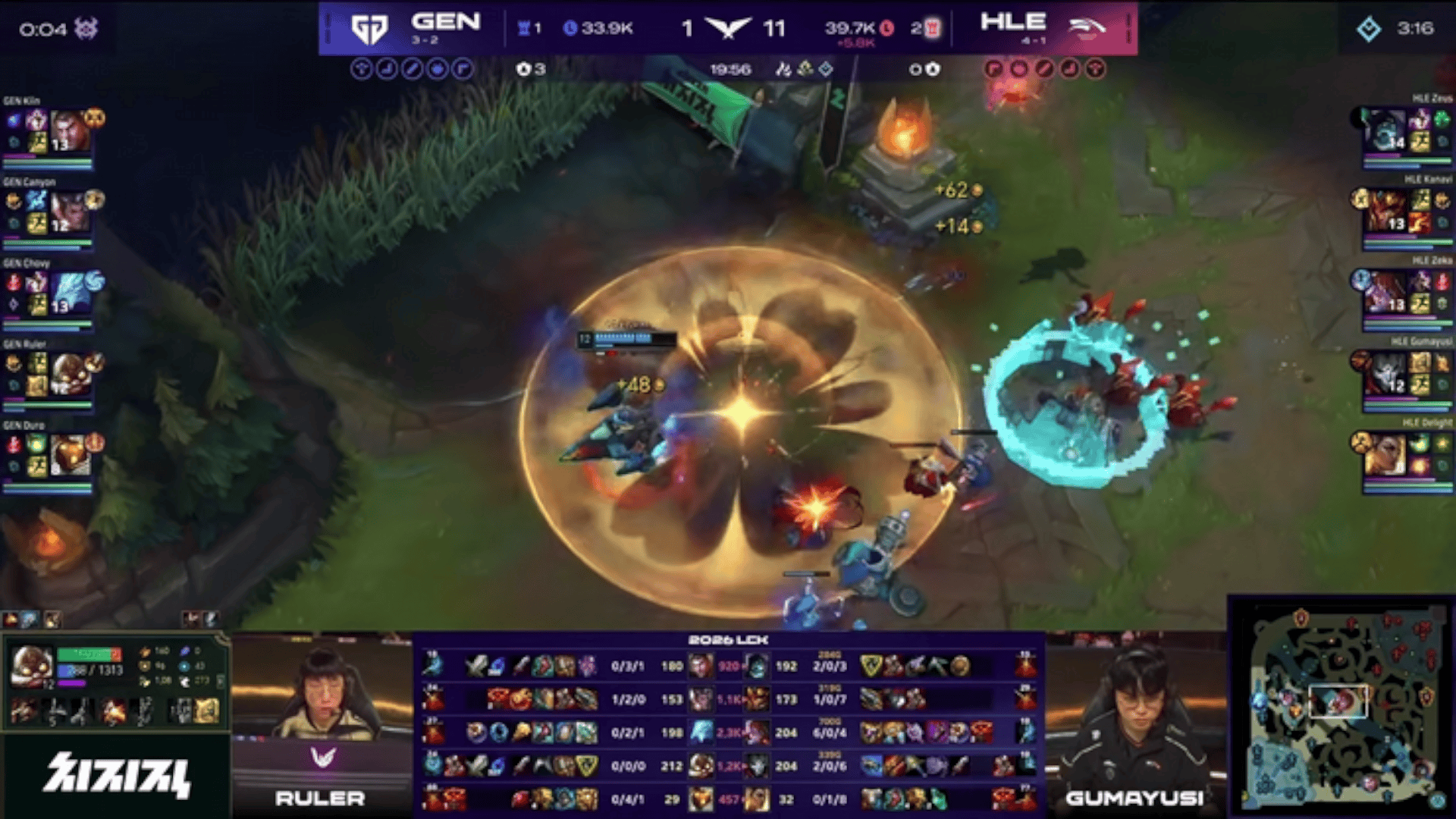 LCK:HLE大龙逼团得手,Zeka阿萝拉三杀击溃GEN后一波