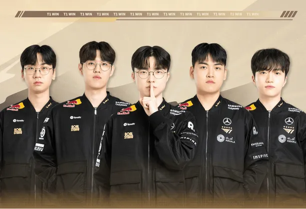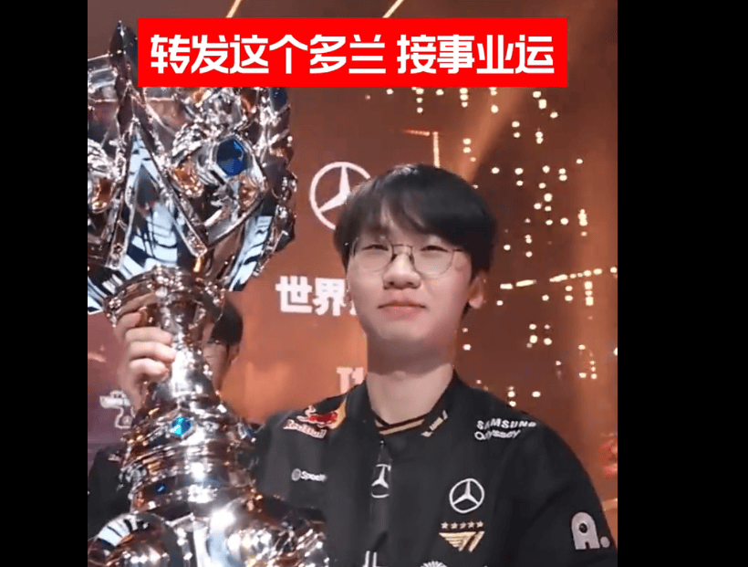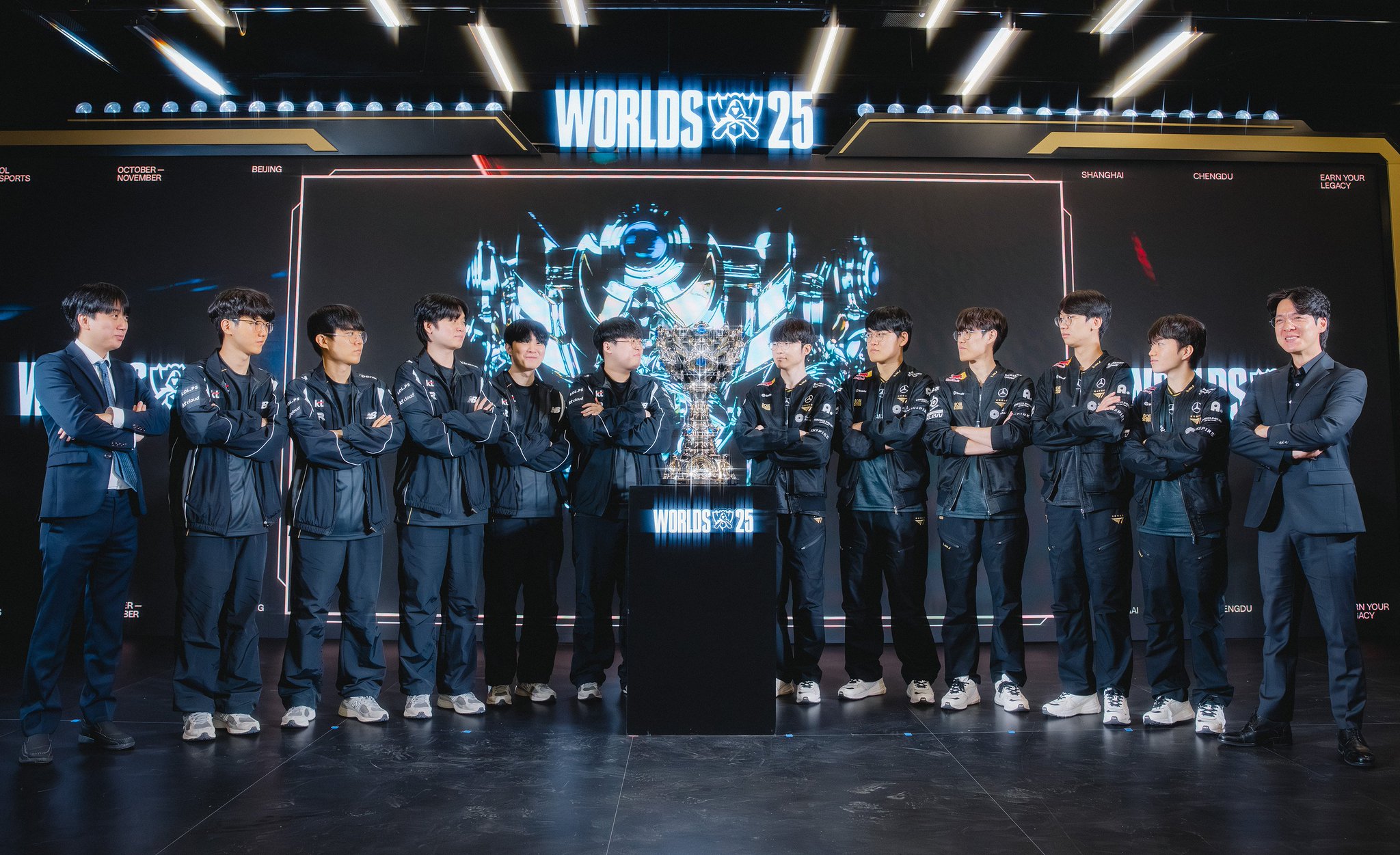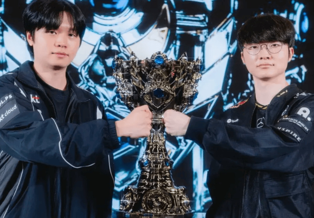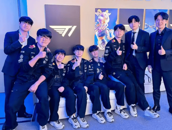 赛事官方分享T1、KT队员在召唤师奖杯前合影:S15决赛队伍