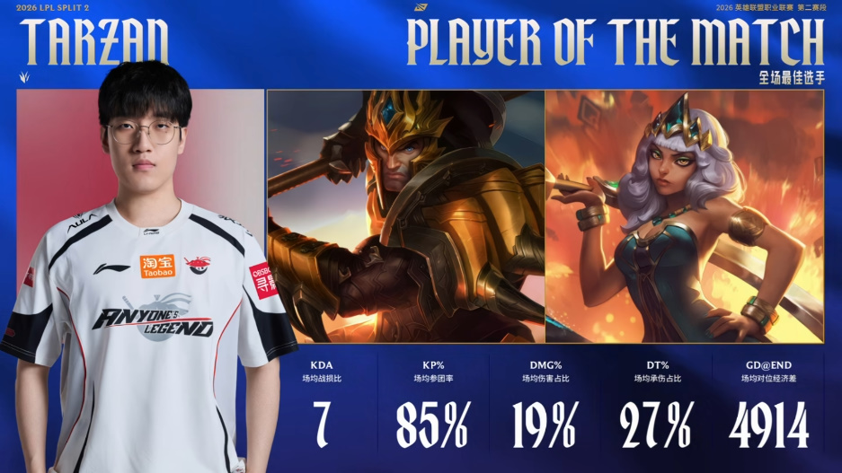 Tarzan奇亚娜打出6/3/5战绩,斩获AL对战NIP次局MVP