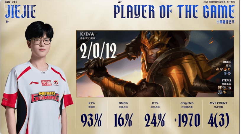 Jiejie皇子打出2/0/12战绩,拿到WBG对阵TES赛点局MVP