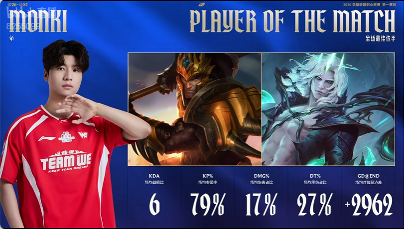 Monki操刀皇子和佛耶戈拿到WE对阵TT比赛的全场MVP