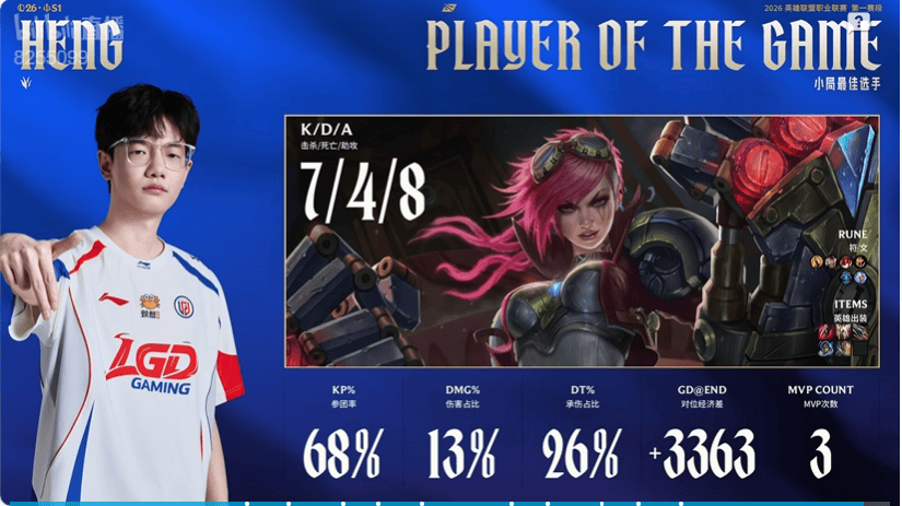 Heng操刀蔚打出7/4/8战绩,拿到LGD对阵OMG次局比赛MVP