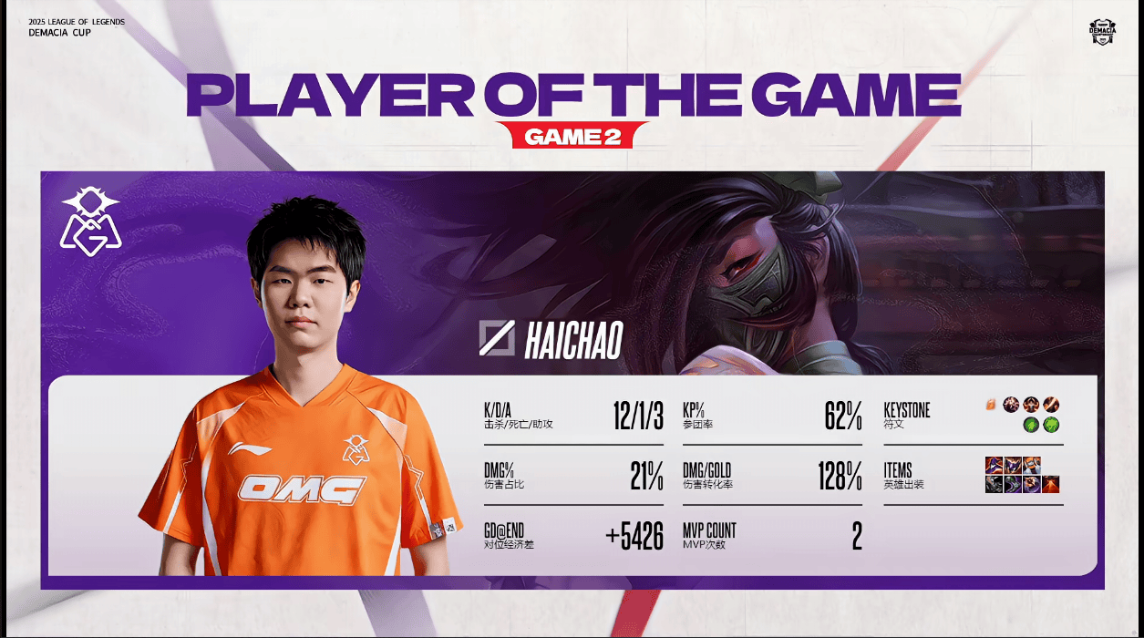 haichao阿卡丽打出12/1/3战绩,斩获OMG对阵BLG第二局MVP