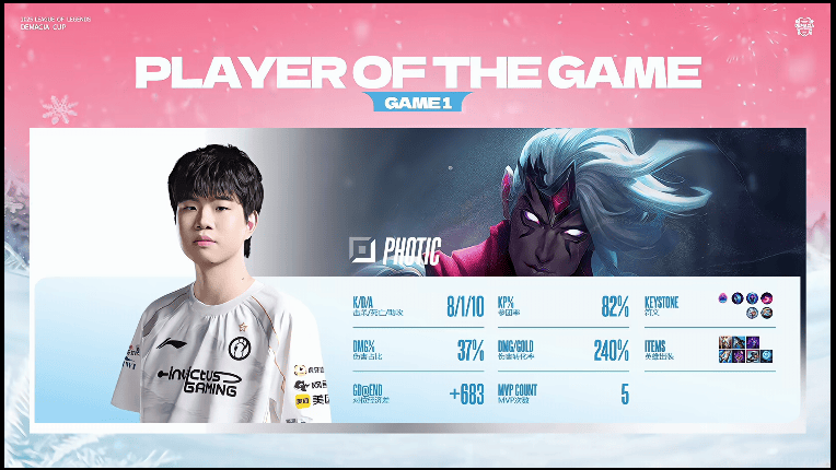 Photic使用韦鲁斯打出8/1/10战绩,斩获IG对阵LNG第一局MVP