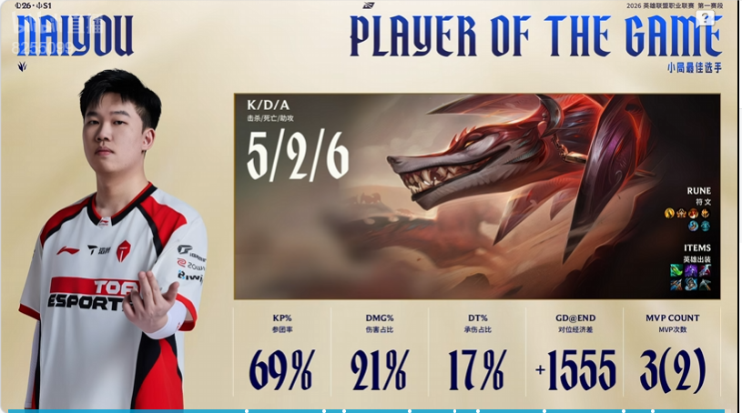 Naiyou纳亚菲利打出5/2/6战绩,拿到TES对阵WBG次局比赛MVP