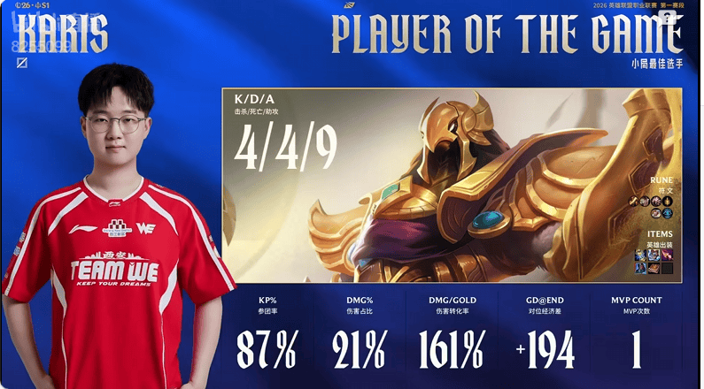 Karis操刀沙皇打出4/4/9战绩拿到WE对阵EDG次局比赛MVP