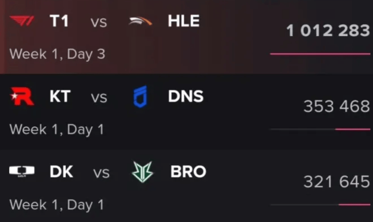 这几天LCK比赛收视,T1打HLE的收视数据一骑绝尘