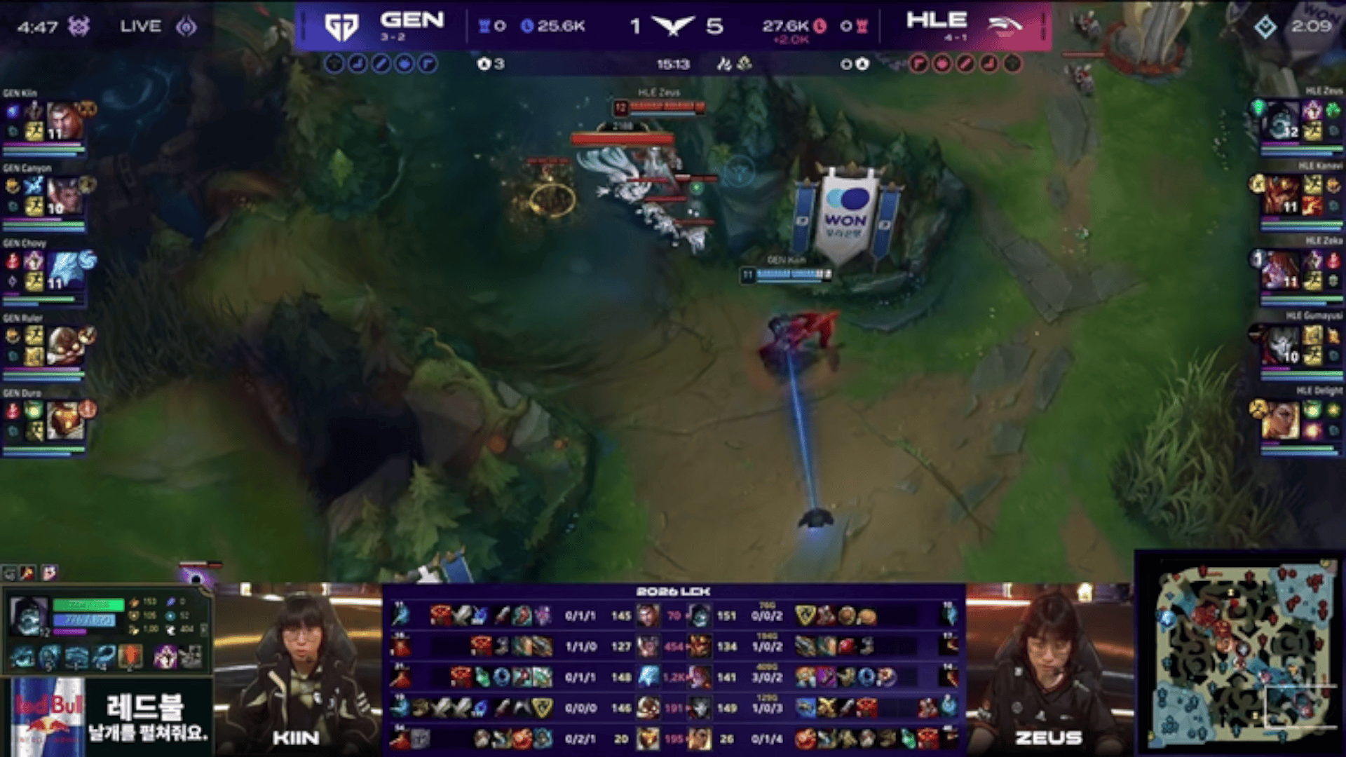 LCK:Delight芮尔闪现开两个,HLE小龙团1换3大胜GEN