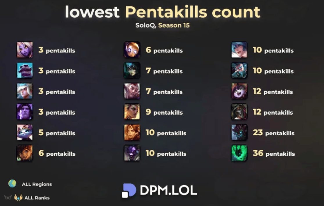 年度众英雄单双排位最低五杀次数统计,谁最难做到五杀?