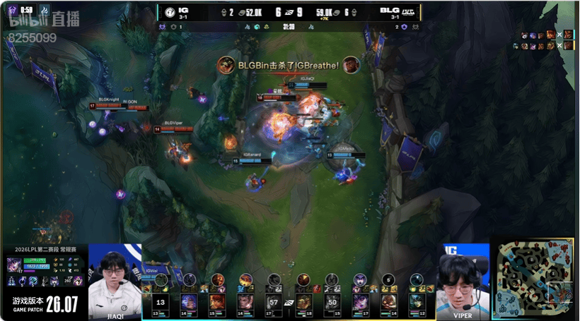 Bin鳄鱼在龙坑牵制对方火力后过墙撤退,BLG击杀Wei赵信拿到大龙