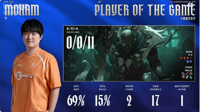 Moham派克打出0/0/11战绩,拿到OMG对阵LGD第三局比赛MVP