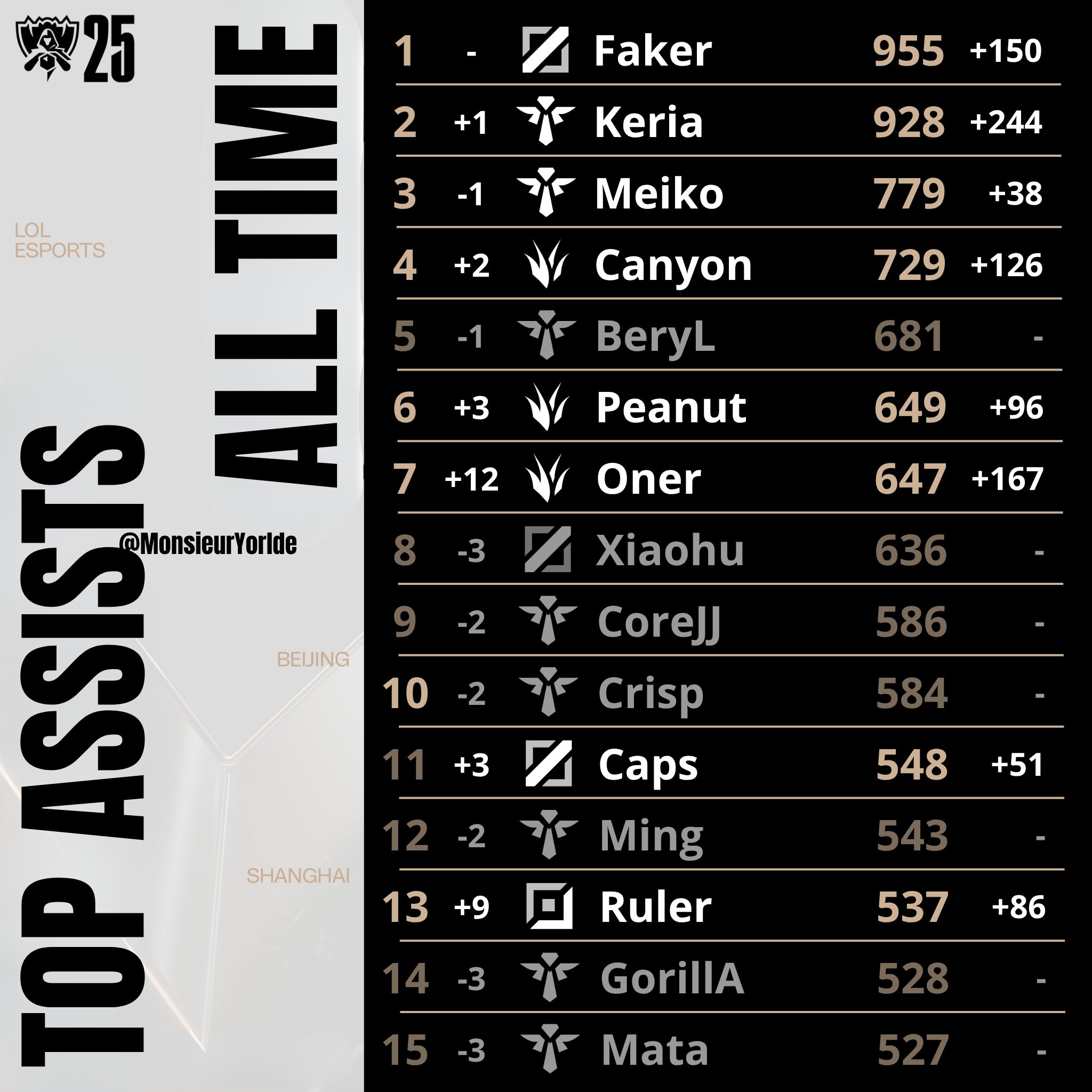 外媒统计全球总决赛最新助攻榜:Faker、Keria有望破千