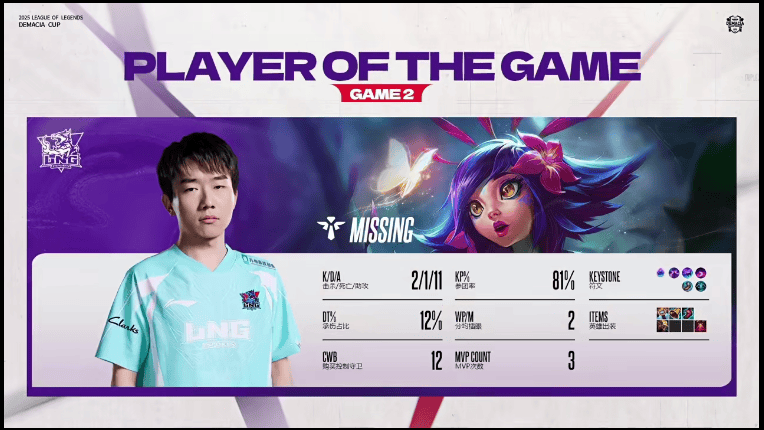 MISSING使用妮蔻打出2/1/11战绩,斩获OMG对阵LNG第二局MVP