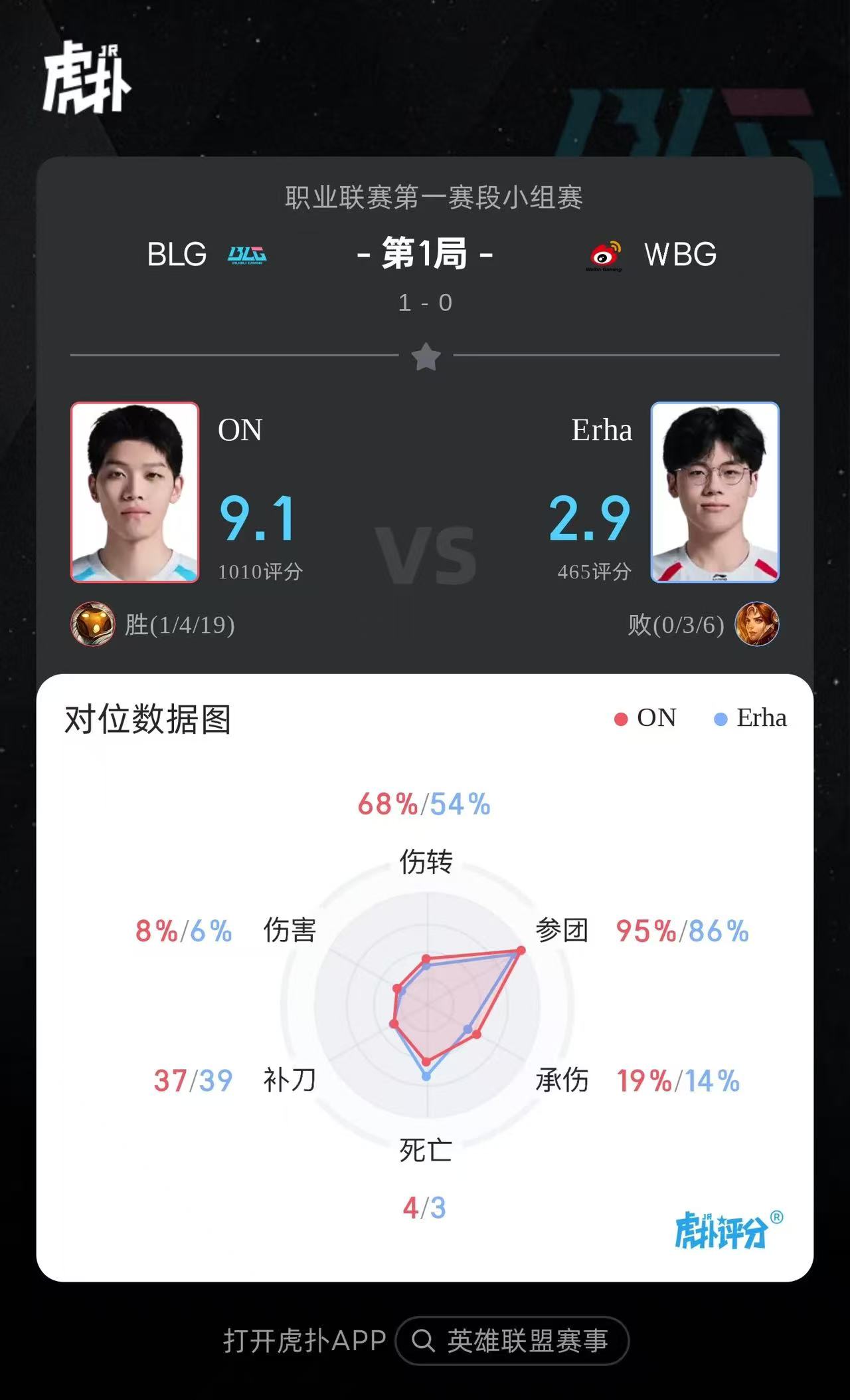 ON巴德打出1/4/19战绩,斩获BLG对阵WBG第一局MVP