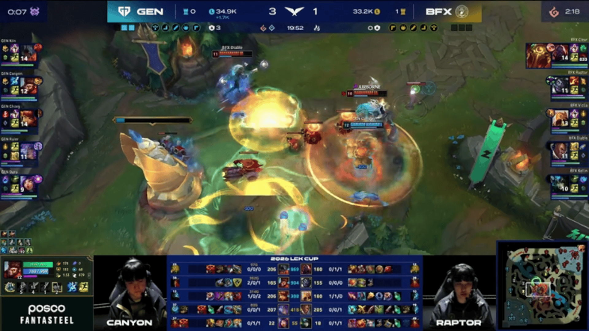 LCK:Kiin剑魔爆砍双杀,GEN中路0换3大胜BFX