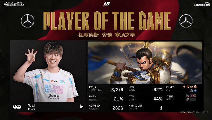 Wei使用赵信打出3/2/9战绩,斩获BLG对阵LNG第二局MVP