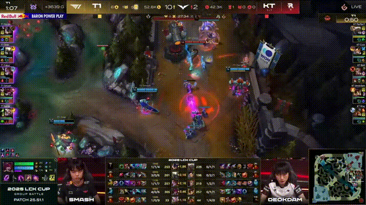 LCK:Faker阿萝拉绕后瞬秒炸弹人,T1下路击杀KT三人后一波