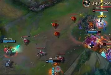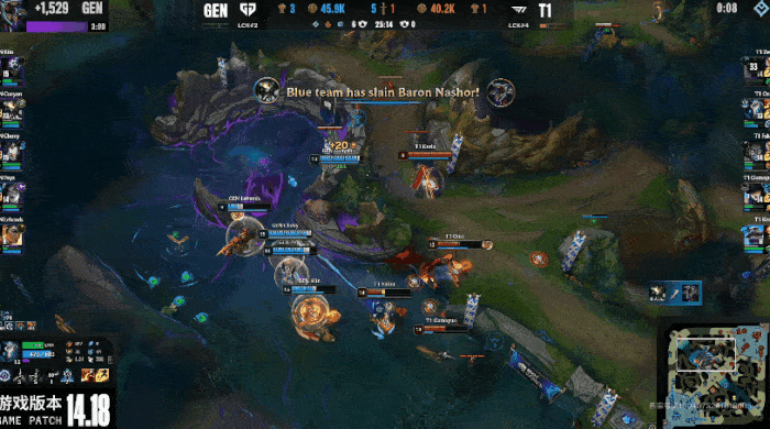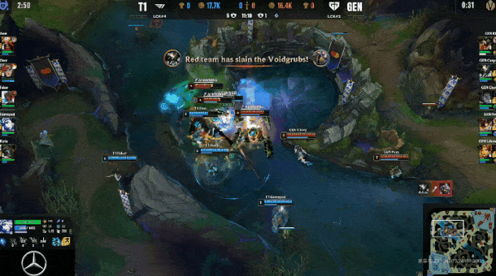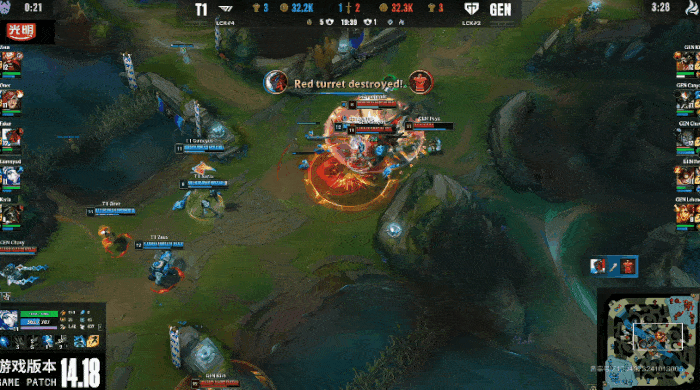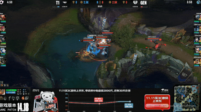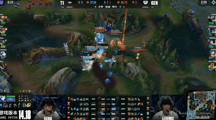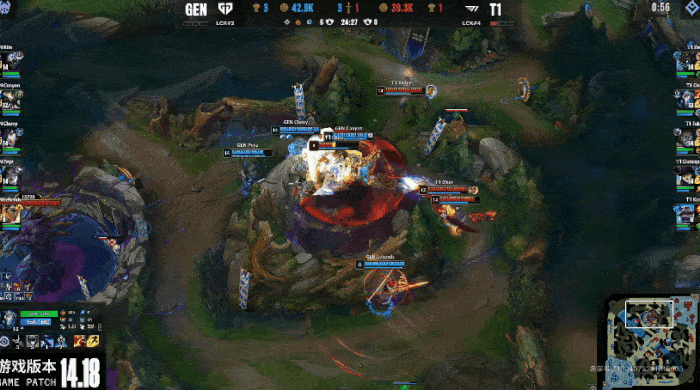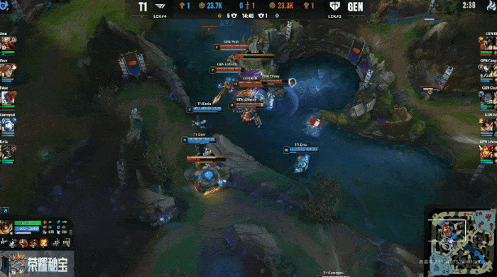 T1疯狂进攻抓住GEN机会,逐个击破击杀GEN三人