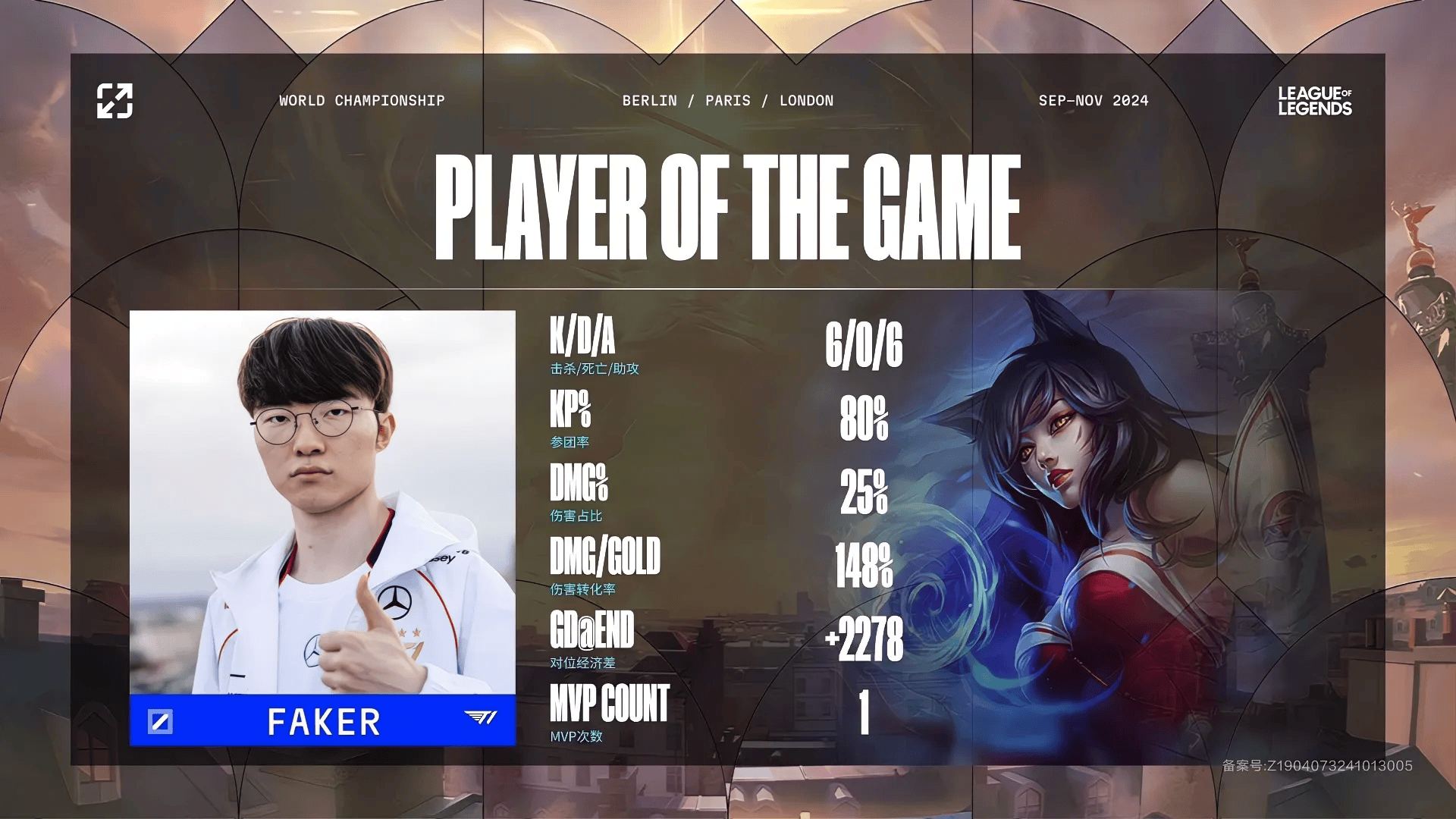 Faker阿狸6/0/6参团率80%,拿下T1对阵TES次局MVP