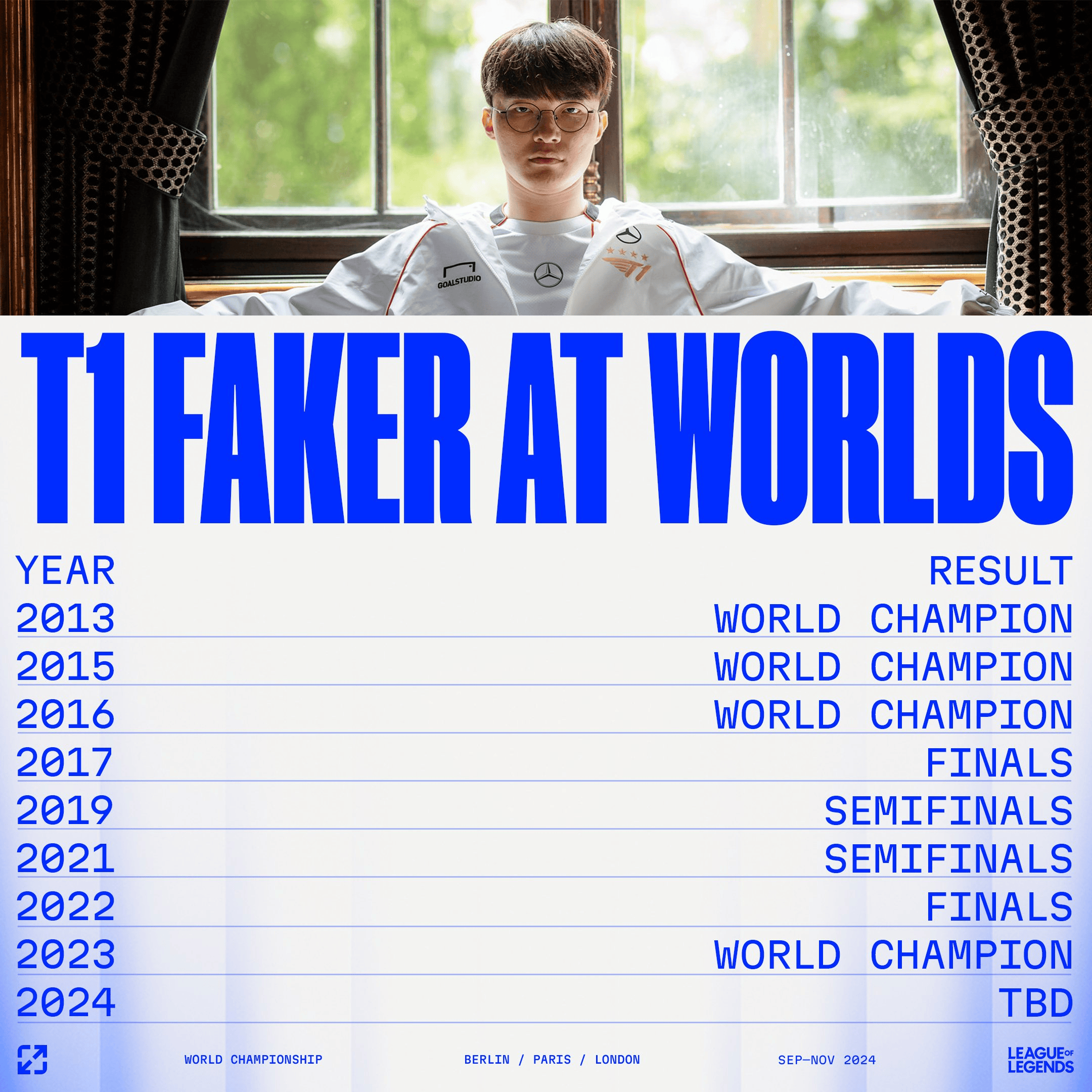 LOL官推晒Faker历届世界赛成绩:4次冠军2次亚军2次四强