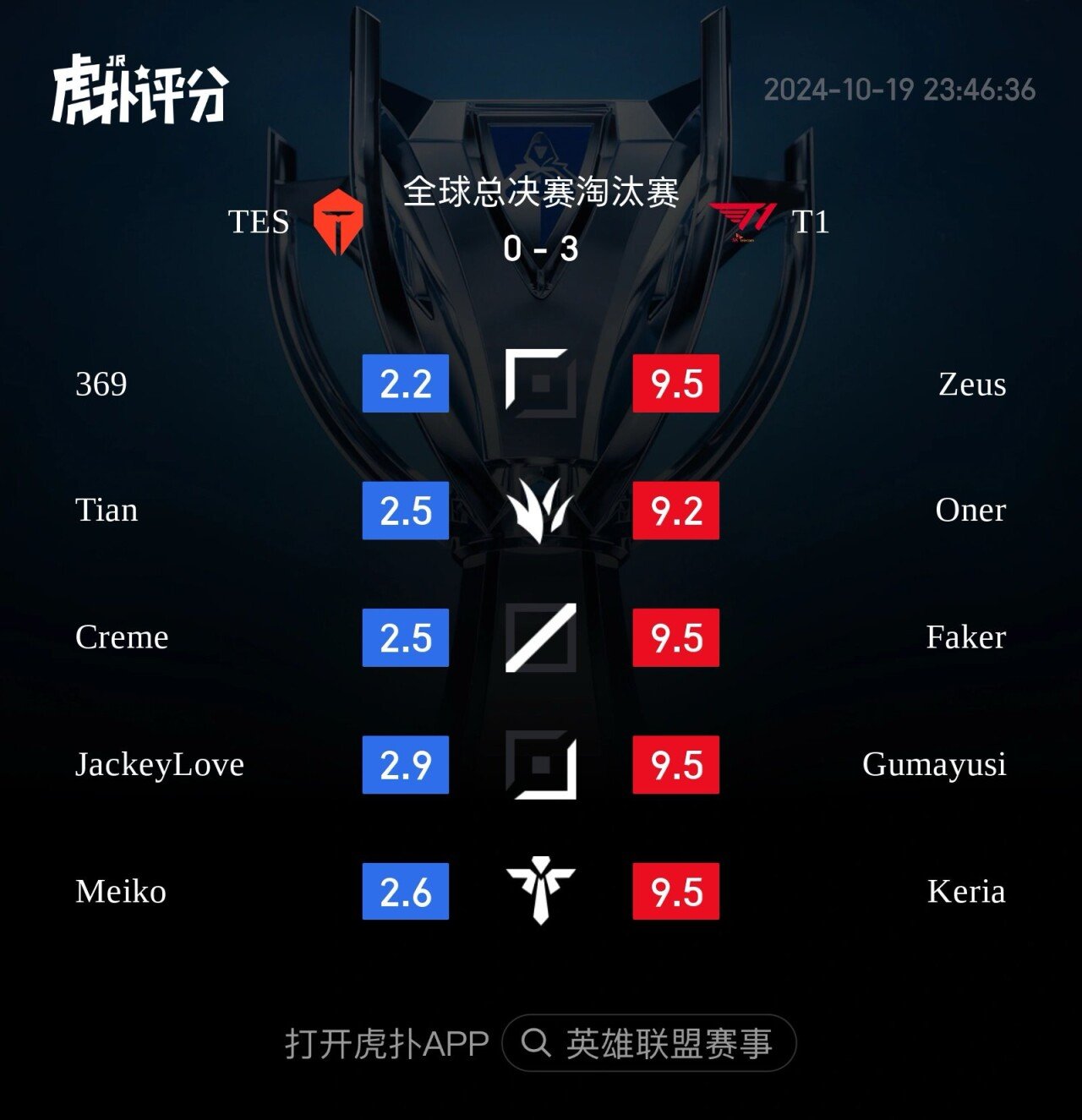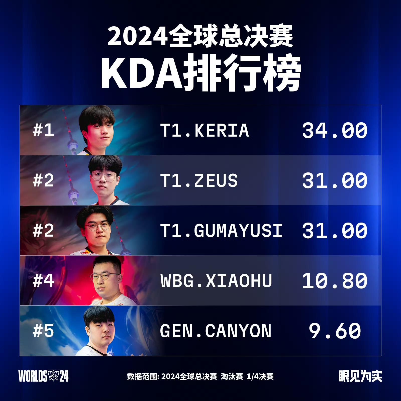 官方发布淘汰赛KDA前五:T1上下辅包揽前三,Xiaohu第四
