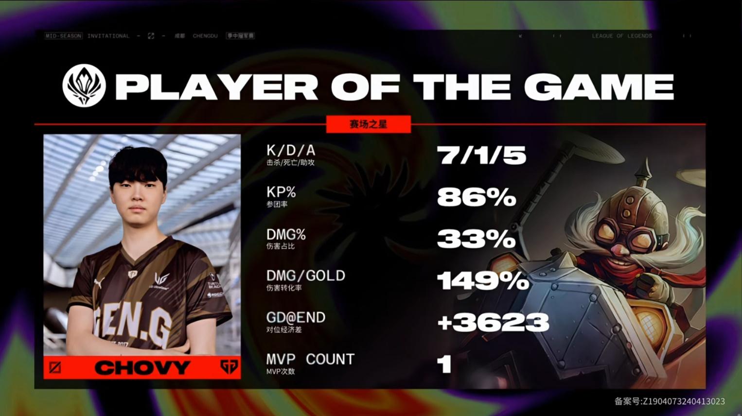 Chovy飞机砍下7/1/5战绩,拿到GEN对战FNC第一局MVP