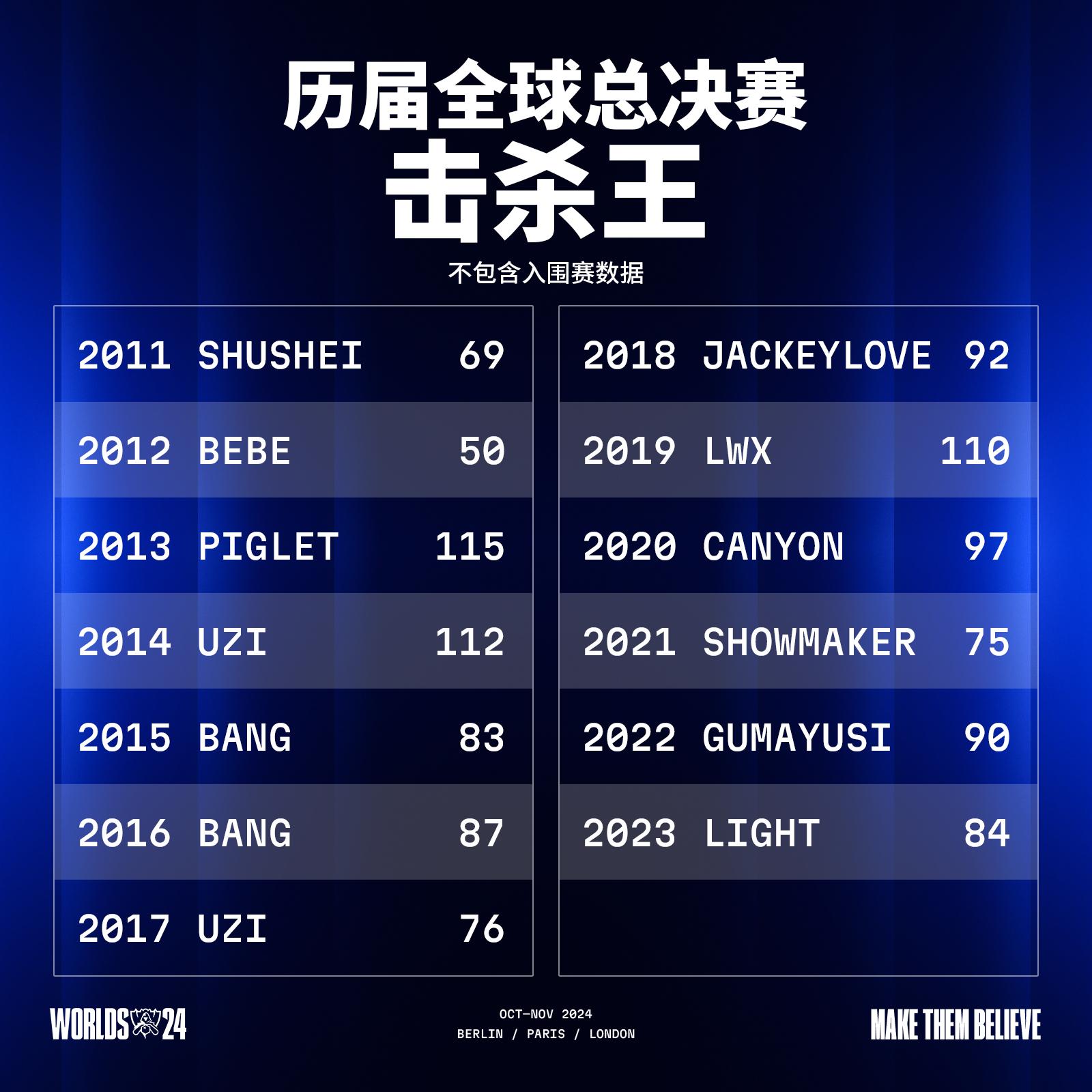 历届全球总决赛击杀王:LPL选手五次拿到世界赛击杀王