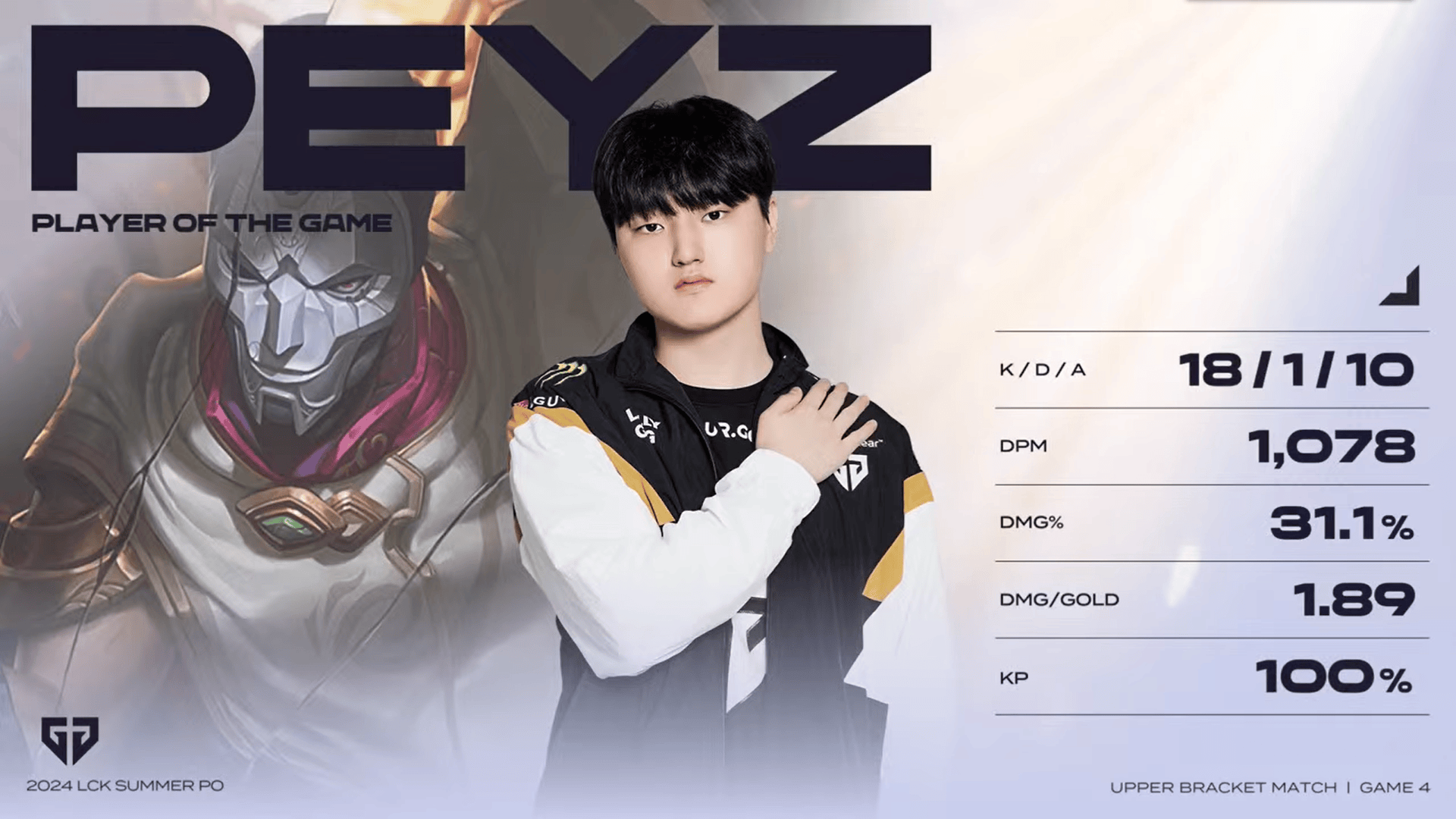 Peyz烬砍下18/1/10的战绩,拿下GEN对阵HLE第四局MVP
