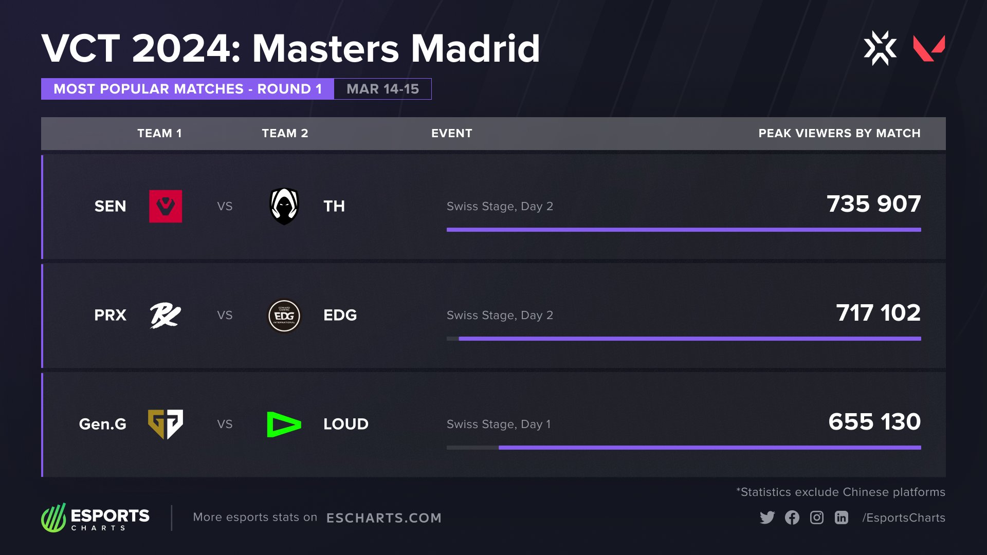 外媒统计马德里大师赛首轮观看数据:EDG对阵PRX位列第二