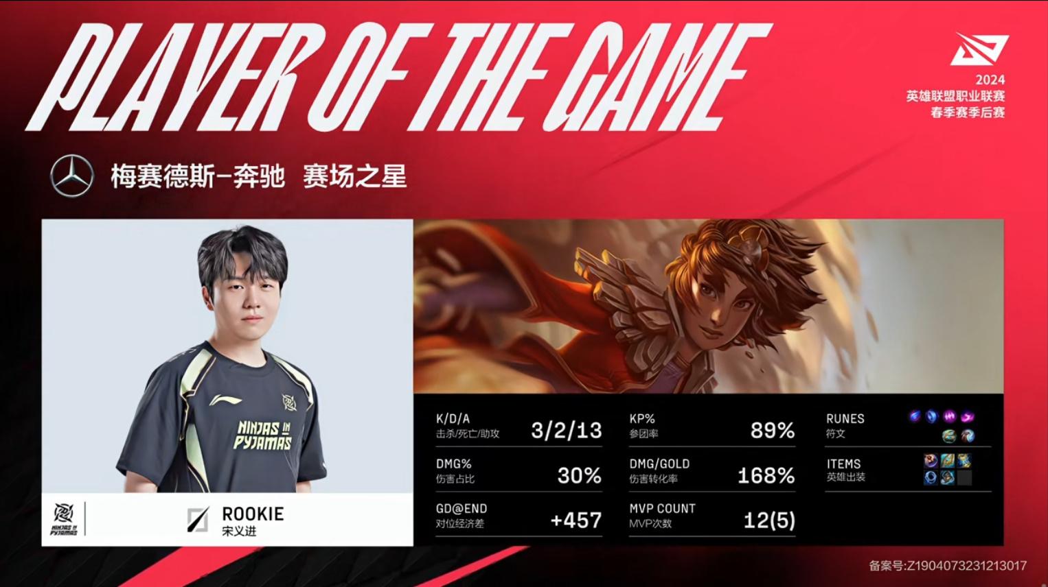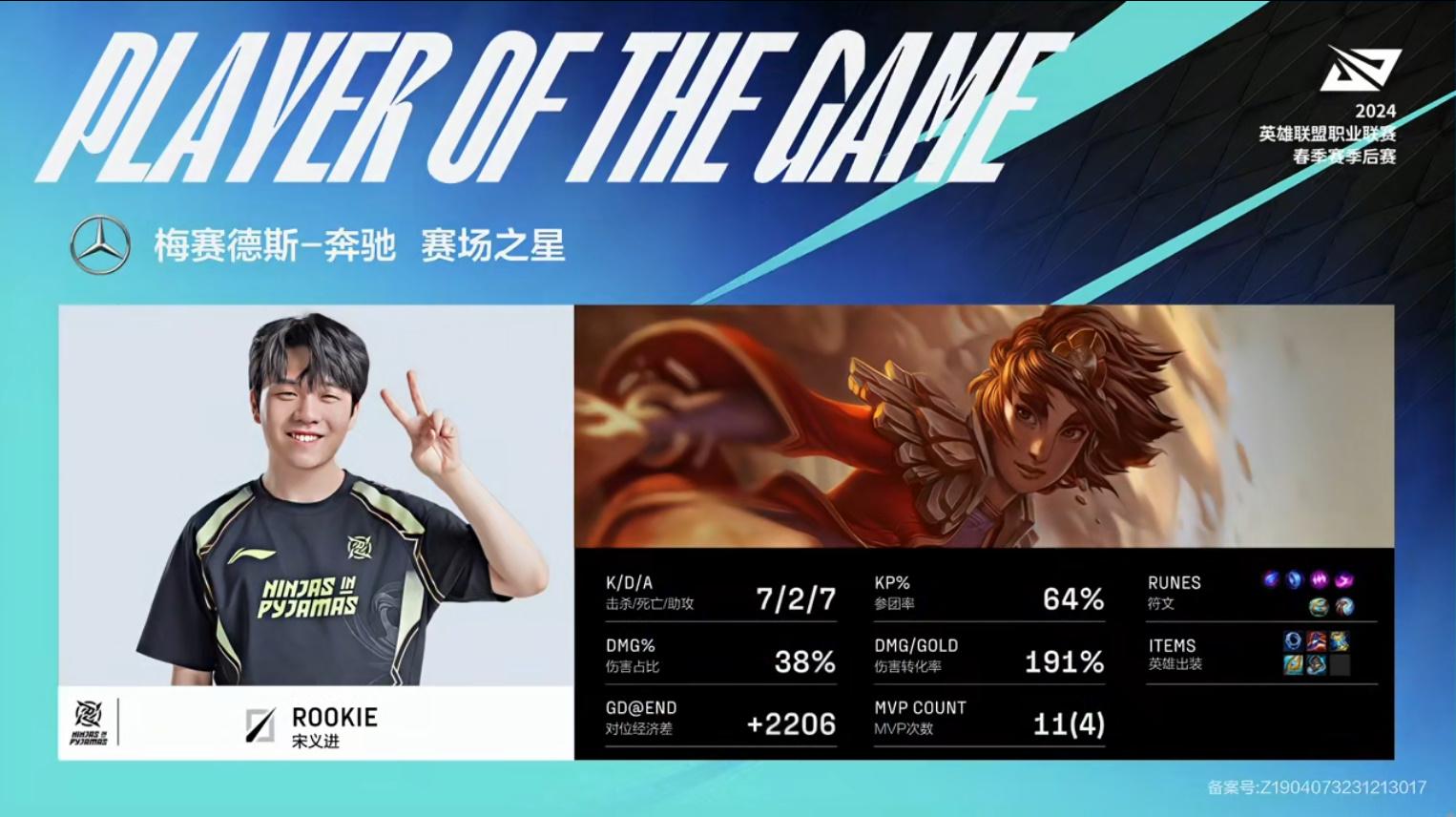 Rookie岩雀砍下7/2/7战绩,拿到NIP对战JDG第三局MVP