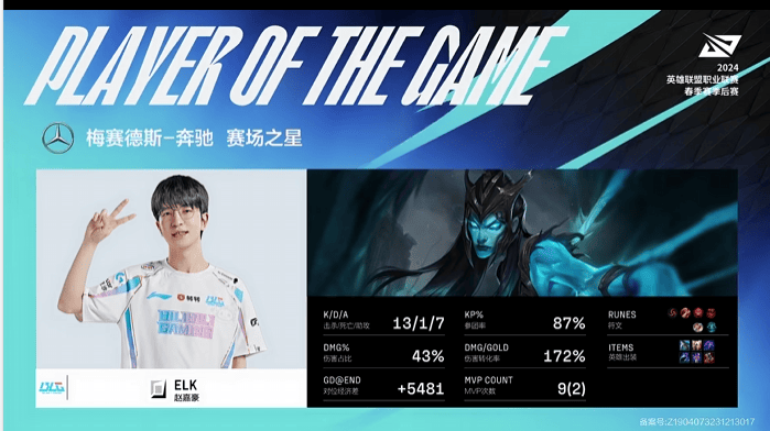 Elk卡莉斯塔打出13/1/7战绩,拿到BLG对阵TES第三局比赛MVP