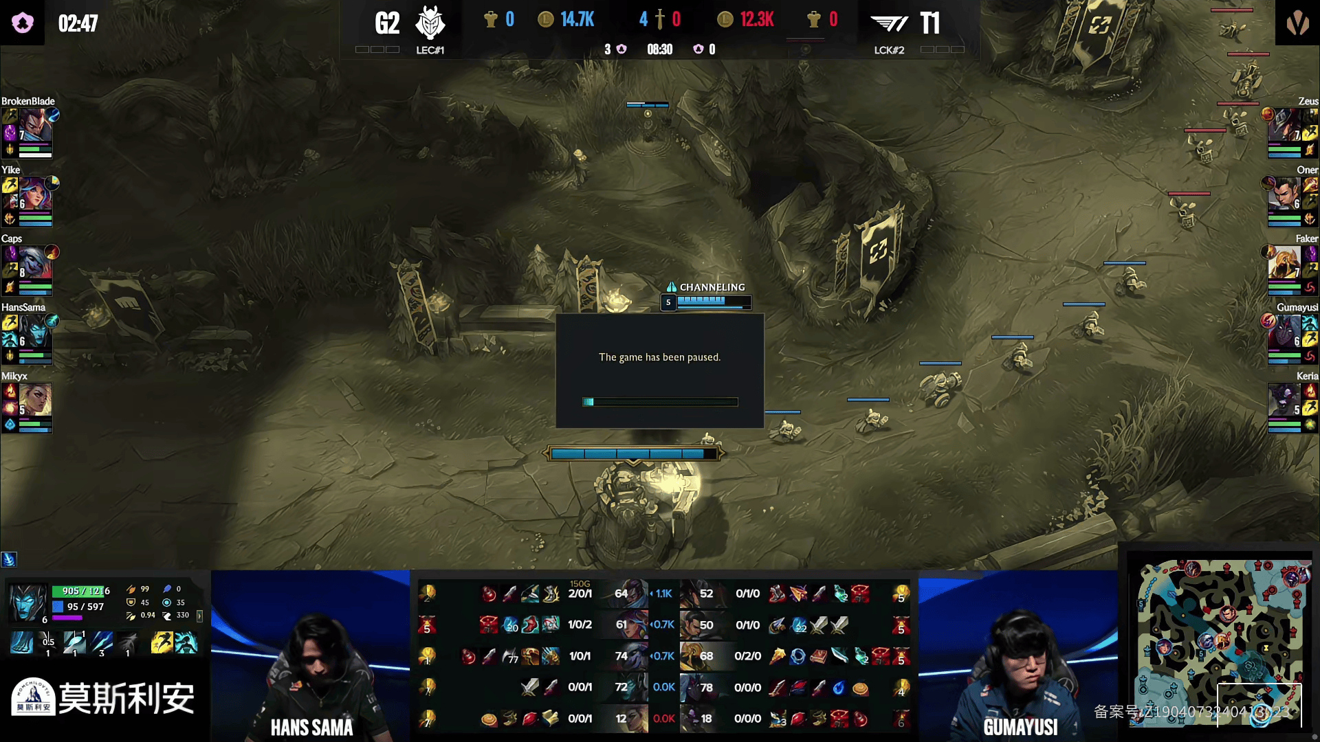 G2对阵T1首局因Gumayusi反应游戏内问题暂停,现已恢复进行