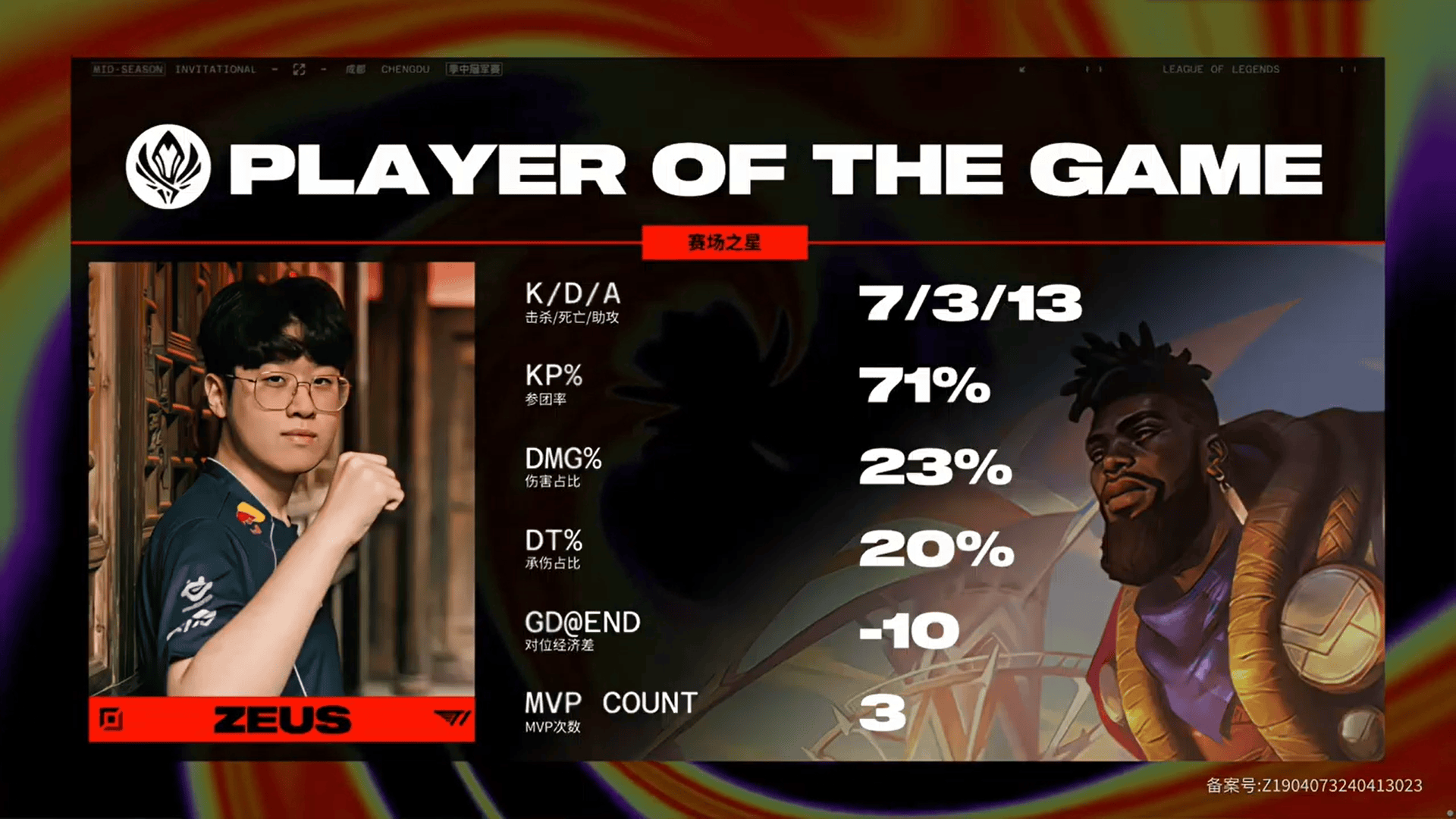 Zeus奎桑提砍下7/3/13的战绩,拿下T1对阵BLG第四局MVP
