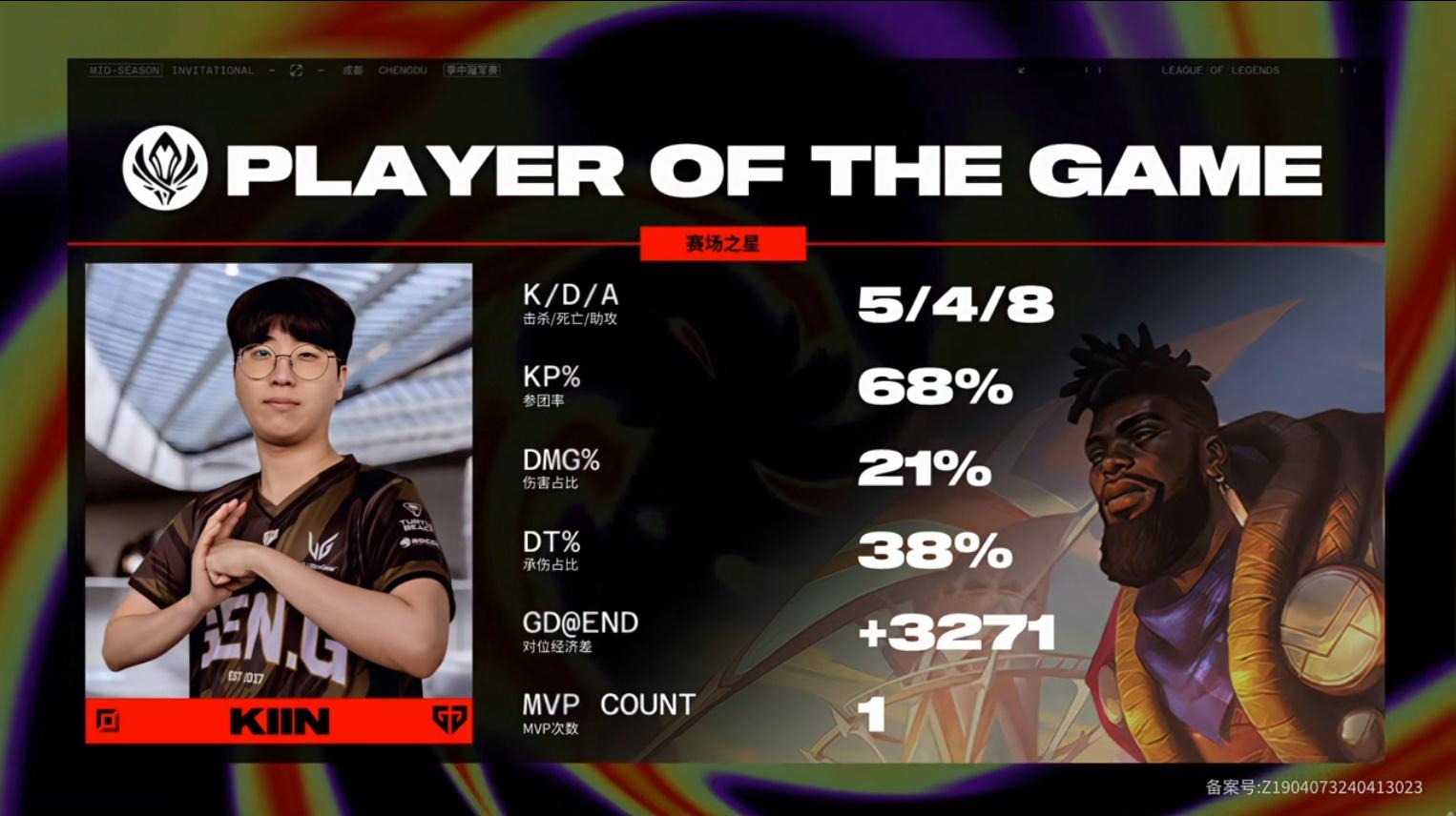 Kiin奎桑提砍下5/4/8战绩,拿到GEN对战FNC第二局MVP