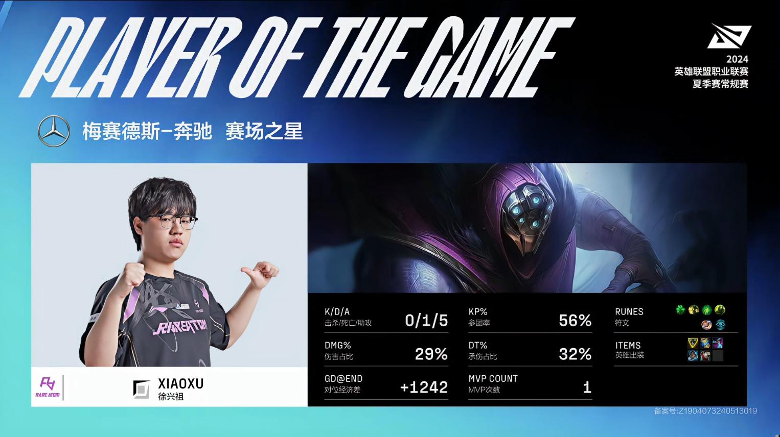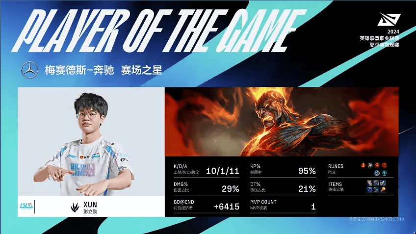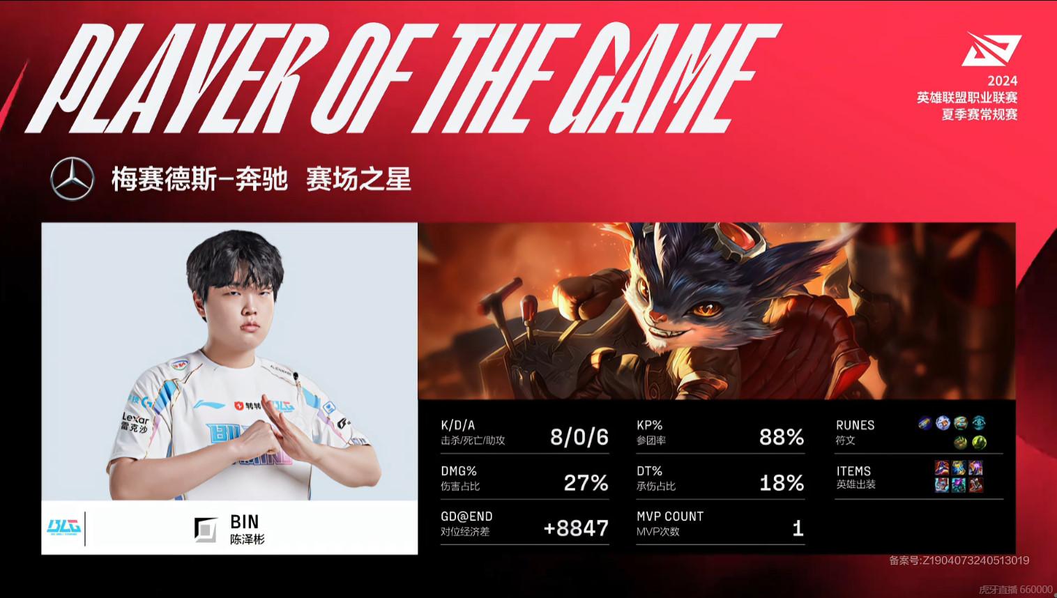Bin兰博砍下8/0/6的战绩,拿下BLG对阵LGD次局MVP