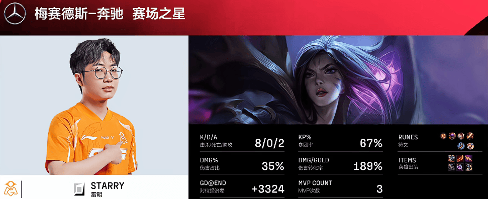 Starry卡莎打出8/0/2战绩,拿下OMG对阵UP第二局MVP